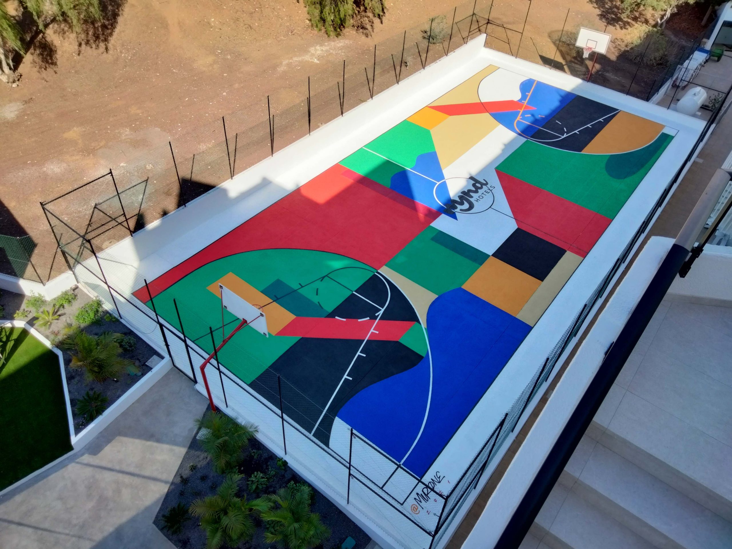 En el nuevo hotel Mynd Adeje encontraremos una obra de arte urbana en la que podremos hacer deporte. El establecimiento presentó a finales del mes pasado la decoración de su nueva cancha de baloncesto, diseñada por el artista bilbaíno Iker Muro.
