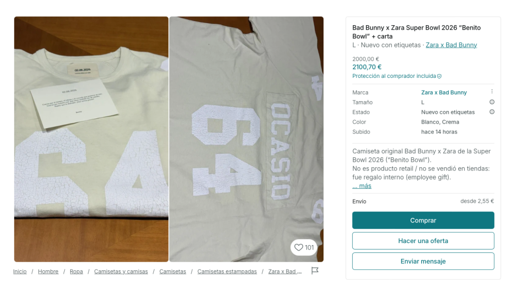 En un tiempo en el que cada movimiento de una estrella global se convierte en contenido, producto o titular, hay historias que nacen pequeñas y acaban creciendo hasta ocupar escaparates. Eso es exactamente lo que ha pasado con la camiseta que Bad Bunny envió a los trabajadores de Inditex tras su actuación en la Super Bowl: lo que comenzó como un gesto de agradecimiento interno ha terminado transformado en una prenda que ahora puede comprar cualquiera.