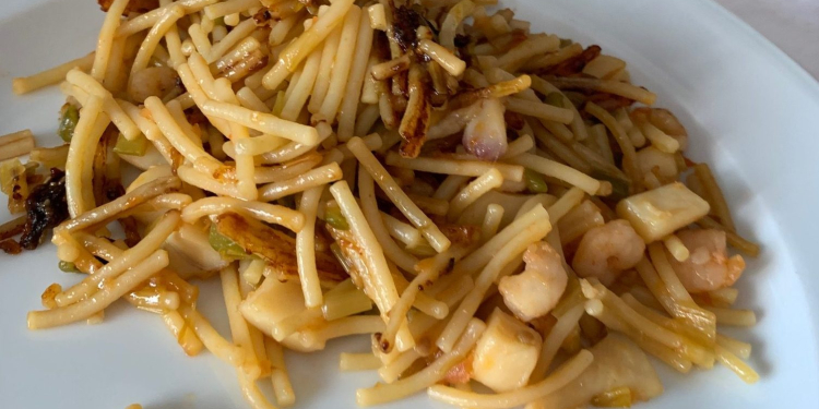 Incorporamos los fideos y vamos echando el caldo (previamente calentado) poco a poco a la fideuá. Un poco antes de que los fideos estén listos, incorporamos las gambas y dejamos «secar» la fideuá unos minutos a fuego medio alto para conseguir el «socarrat» (¡ojo! que no se nos queme).