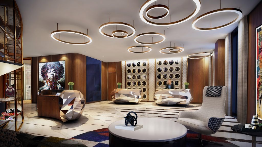 El diseño del interior del hotel ha sido realizado por la galardonada firma de diseño Jeffrey Beers International, que se ha inspirado, como no podía ser de otra manera, en la música y los legendarios objetos que rinden honor a músicos neoyorquinos, entre los que destacarán la cazadora de cuero de Joey Ramone, las botas de charol de Lady Gaga, un tocadiscos perteneciente a Les Paul o las letras manuscritas por John Lennon en 1972 para su homenaje a su ciudad adoptiva, New York City.
