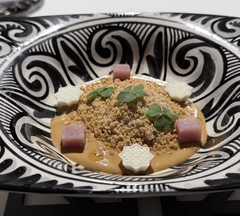 Ruh no se presenta como un simple menú degustación, sino que es un relato. Un hilo que atraviesa la memoria culinaria del Al-Ándalus y la traduce en formas nuevas que emocionan por su pureza y por su intención. Cada pase es un fragmento de un libro que parece escrito hace siglos, pero cocinado con la mirada de hoy.