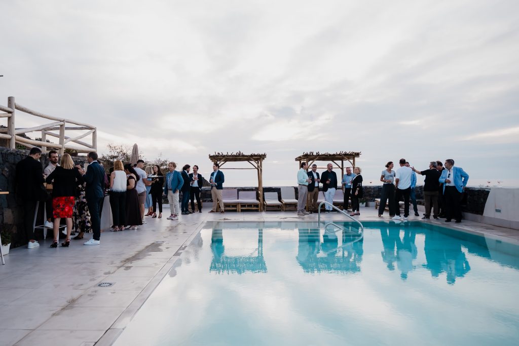 En la zona de la piscina, los asistentes disfrutaron de un cóctel único, acompañado por música en directo con un timplista que marcó el ritmo del atardecer. El sonido del timple, la luz dorada cayendo sobre el horizonte y la brisa templada crearon una atmósfera de calma y conexión, donde cada detalle invitaba a contemplar el paisaje y dejarse llevar por los sentidos.