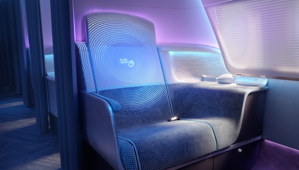 En cuanto a la opción premium, las Salas Pure Skies presentan un diseño de asiento con líneas de visión mínimas, configurando un espacio personal completamente cerrado y separado de los otros por cortinas. Estos han sido confeccionados con acabados y materiales antimicrobianos. Incluso, incorporan sistemas de control de temperatura y de iluminación personal, los cuales se sincronizan con los dispositivos móviles de los pasajeros. Las telas de los asientos incluyen tintas fotocromáticas y termocrómicas que reaccionan a la limpieza UVC y a la desinfección por calor. Hasta muestran mensajes de tranquilidad a los usuarios en el embarque. Cada espacio posee también una gran pantalla, compartimentos superiores y guardarropas personal. Estos dos últimos elementos se auto desinfectan.